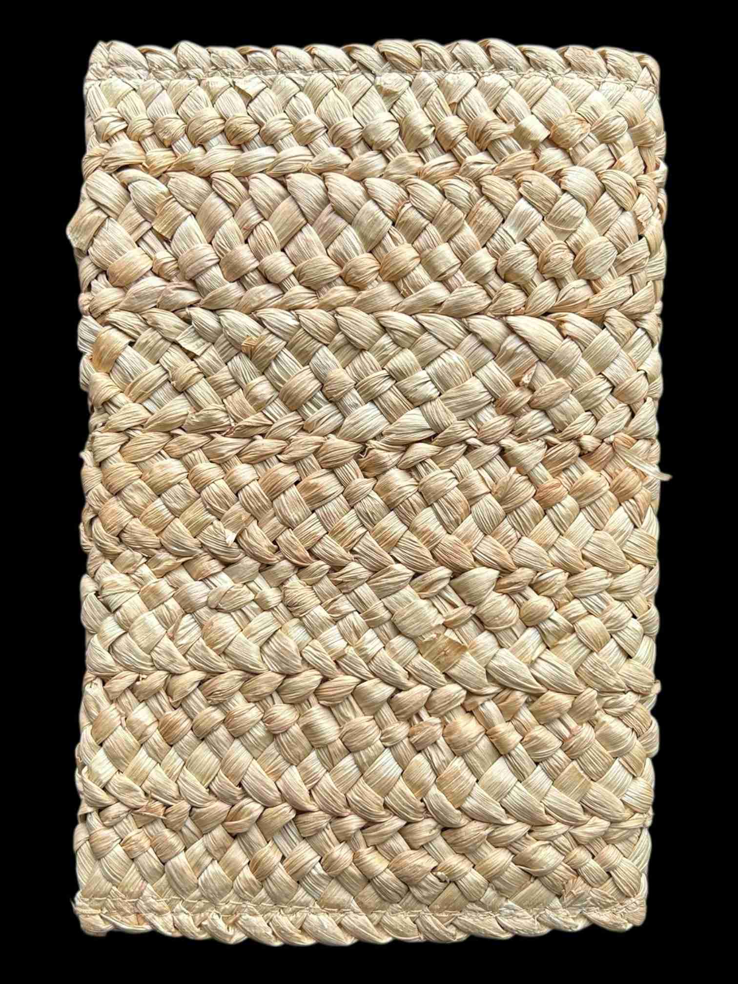Cartera tipo sobre, sutil, de colores vivos y diseño femenino, con forro interior y práctico cierre imantado. Medidas: 25x20 cm. aprox. Materialidad: paja natural tejida ancha.